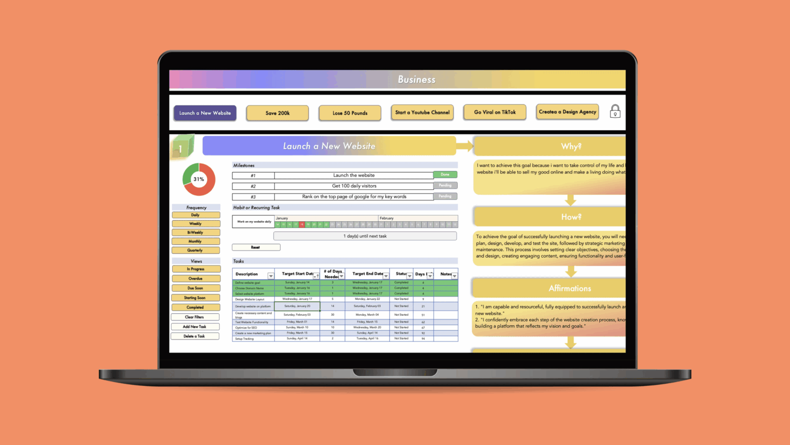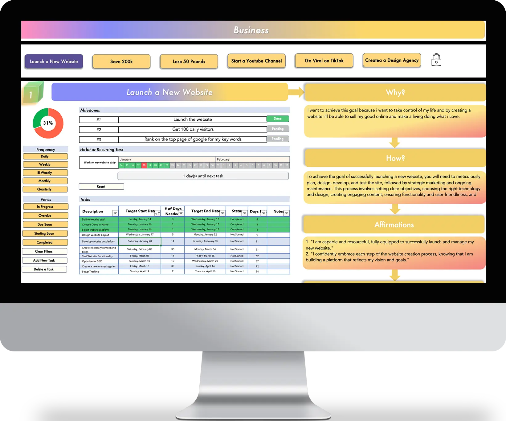 - Automated interface allows you to swiftly move through different goals and make updates or add tasks easily