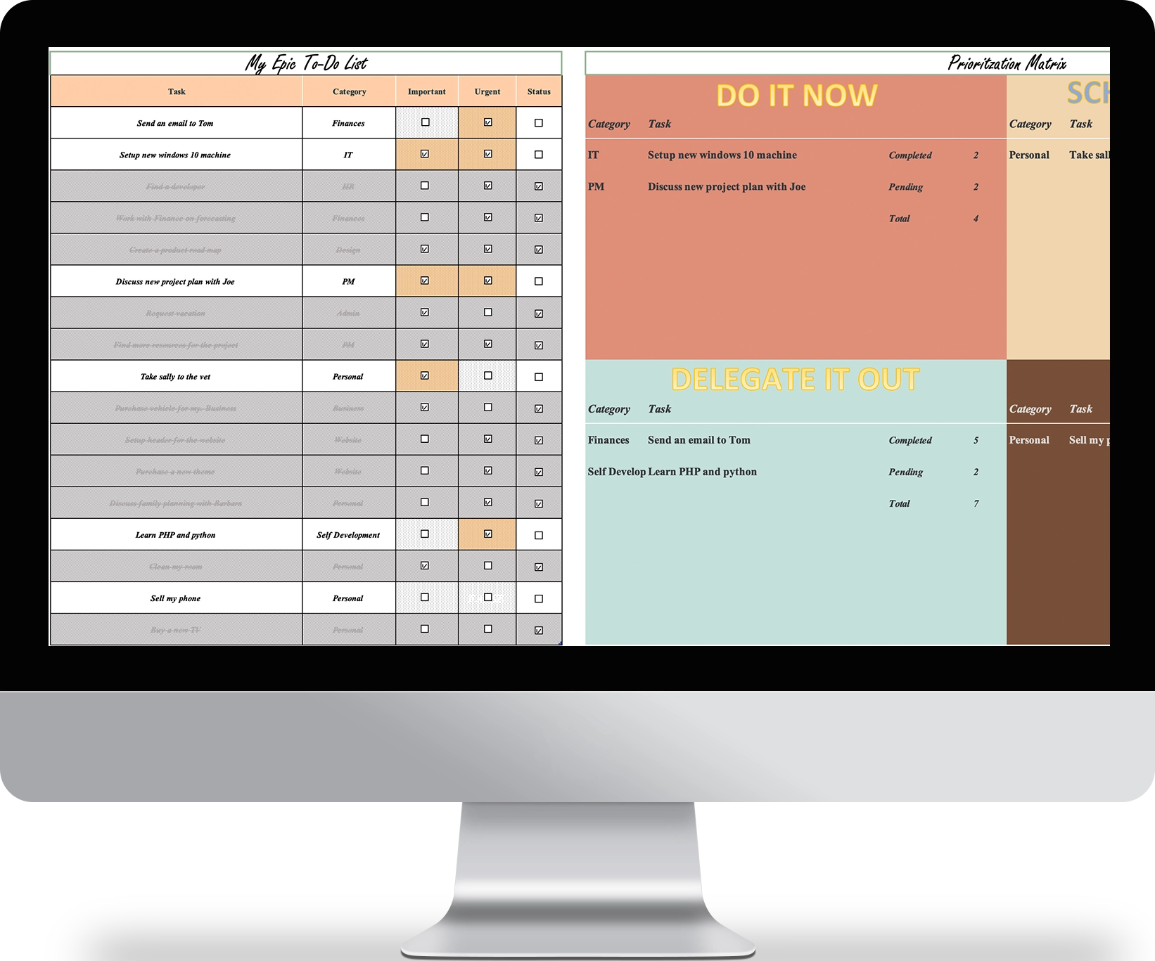 The Eisenhower Matrix for Decision Making excel template will automate prioritizing your tasks by automatically organizing your tasks into into 4 quadrants, as was identified by Mr. Eisen Hower himself.