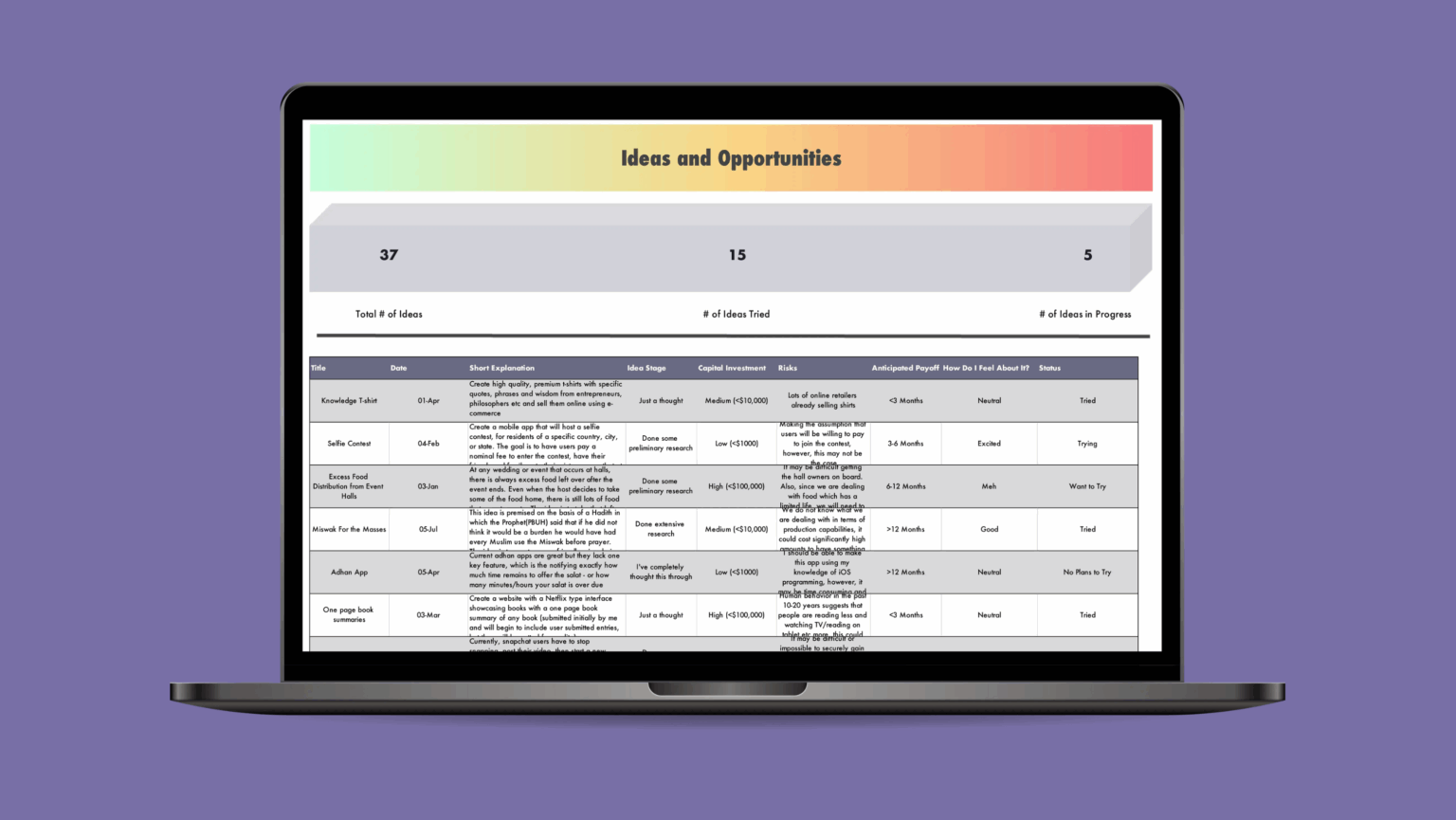 Why let your ideas fade into oblivion when you can have an organized system to develop them? This template allows you to record an unlimited number of ideas, classify them according to their stage of development and determine what level of investment they require, whether low, medium or high. In addition, you can estimate when you expect each idea to start generating returns and document how you feel about it, whether you’re deeply excited about it or whether it’s just a random idea.