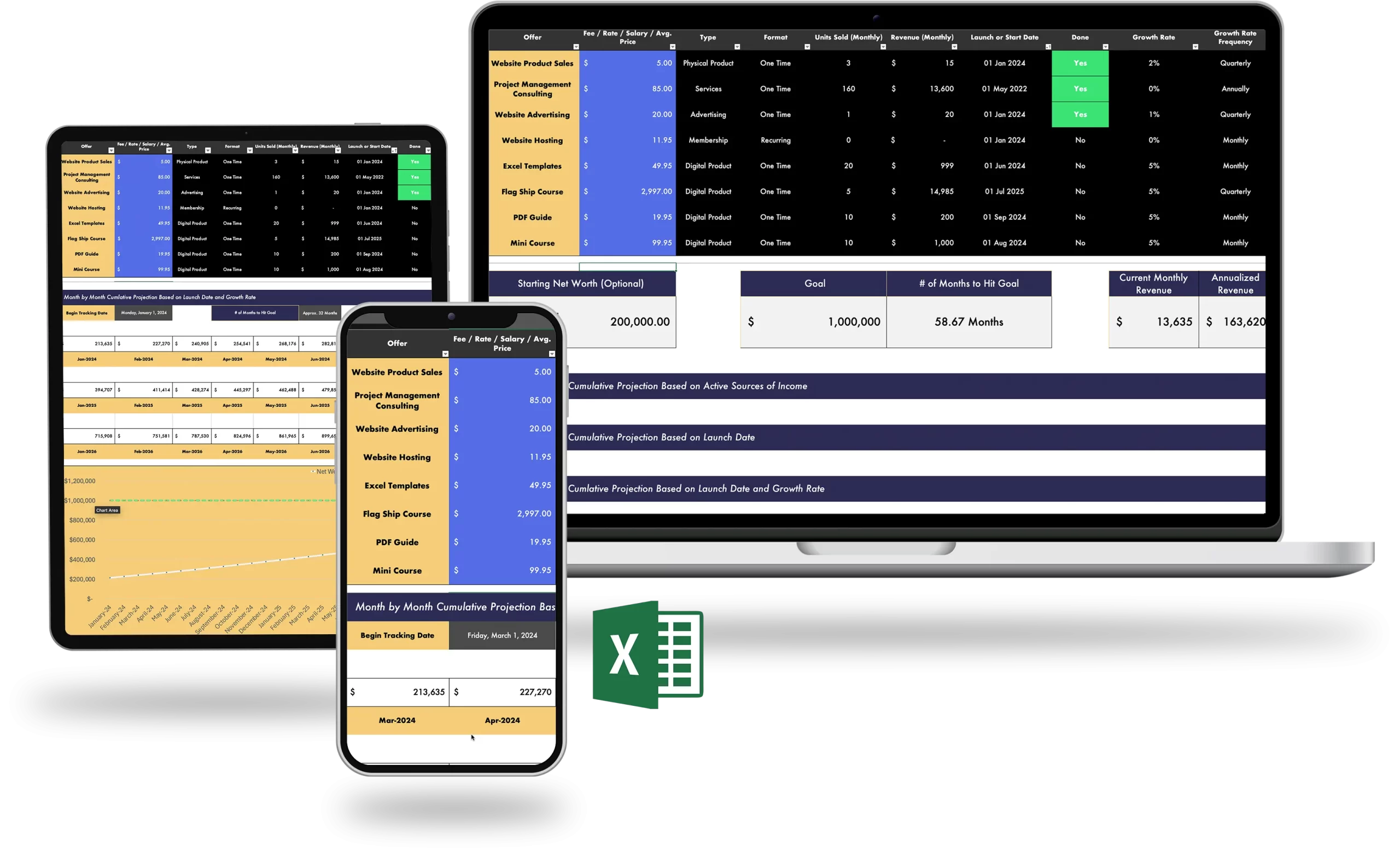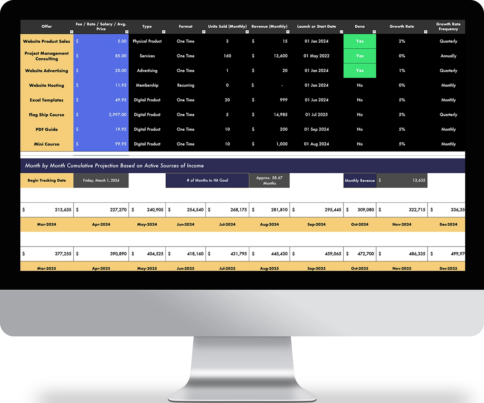 - Ability to set launch dates, growth rates, and growth frequencies for each source of income