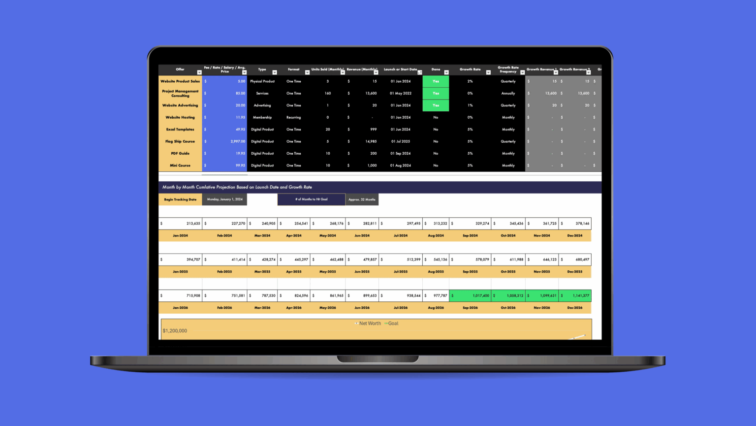 If you are looking for a tool that not only motivates you, but also guides you step by step towards your financial goals, this template is what you need. This Excel template is designed to show you exactly how long it will take you to reach your financial goals. With a simple interface, you can add new sources of income, adjust growth rates and see the direct impact on your monthly income. Whether you’re planning for optimistic or conservative growth, this tool allows you to play with financial scenarios and visualize your progress toward that coveted first million dollars.