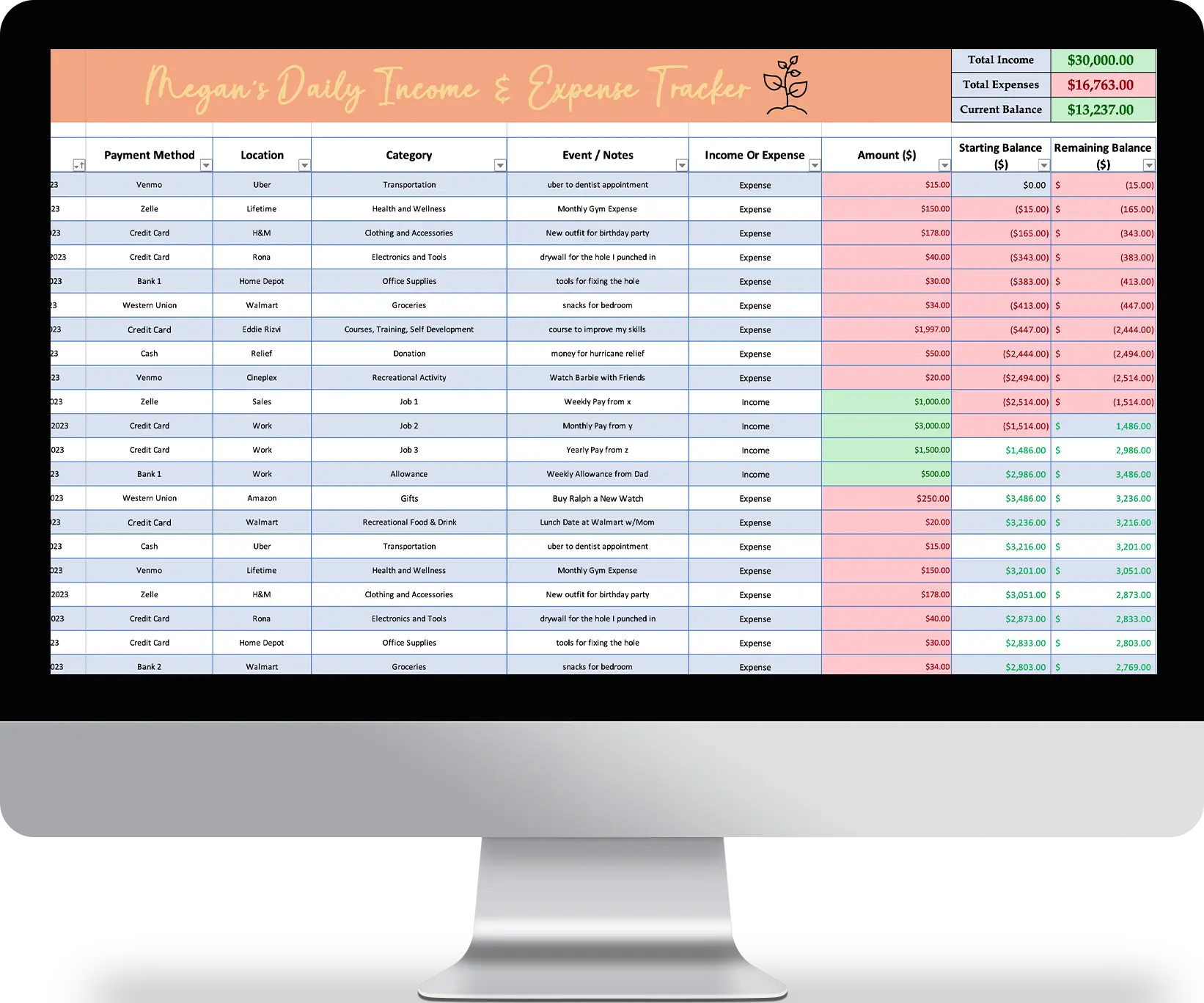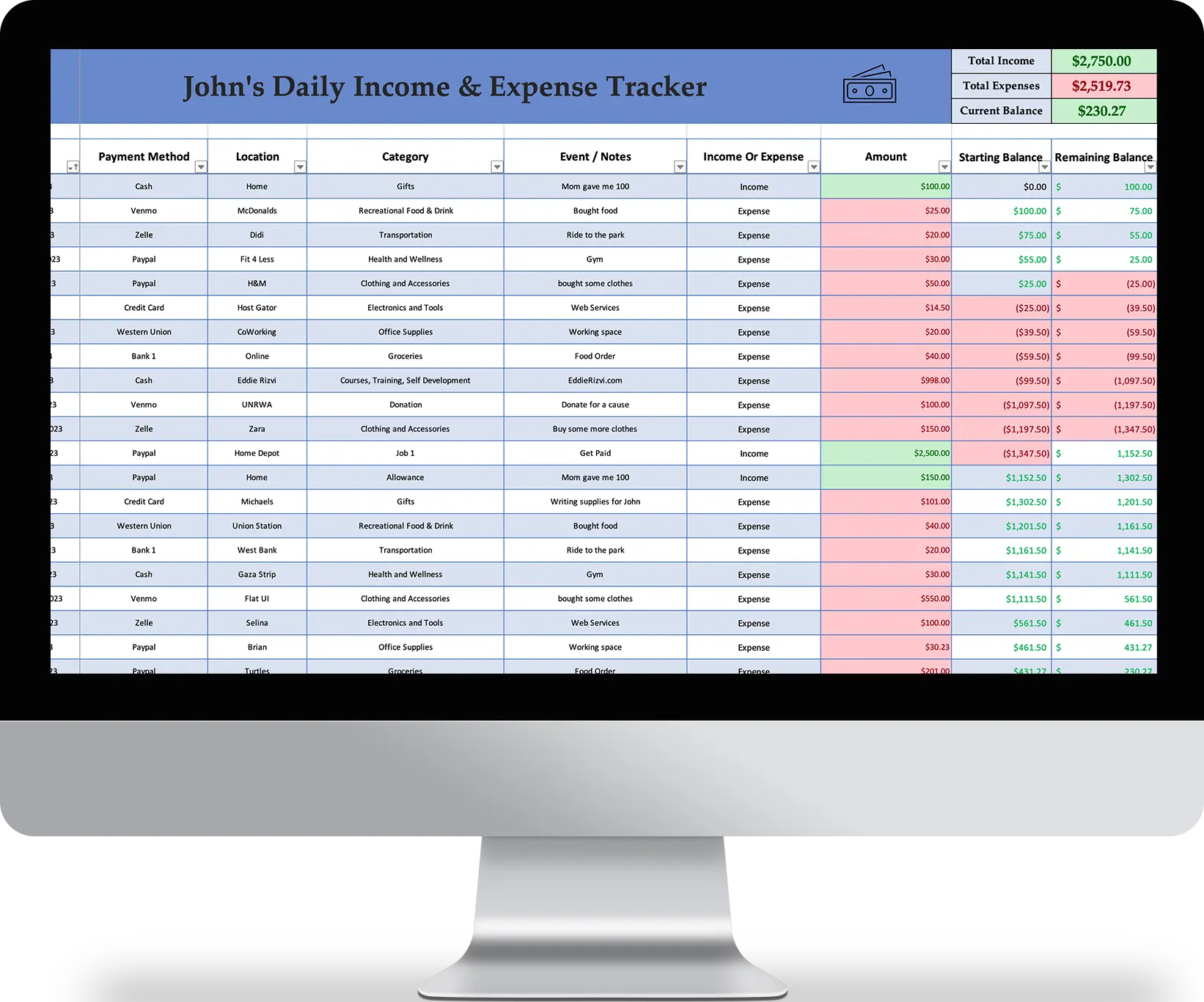 Yes! By using the Simple Expense Tracker template from Eddie Rizvi, you will learn and visually see how you spend your money and whether or not you spend more than you earn.