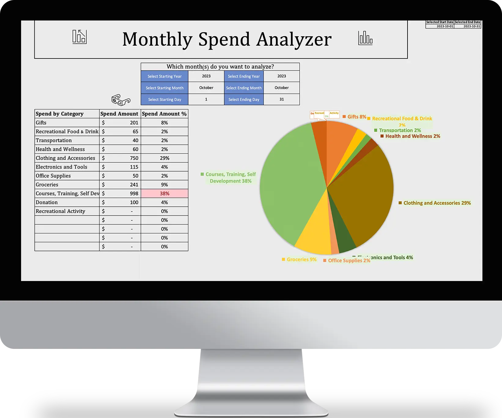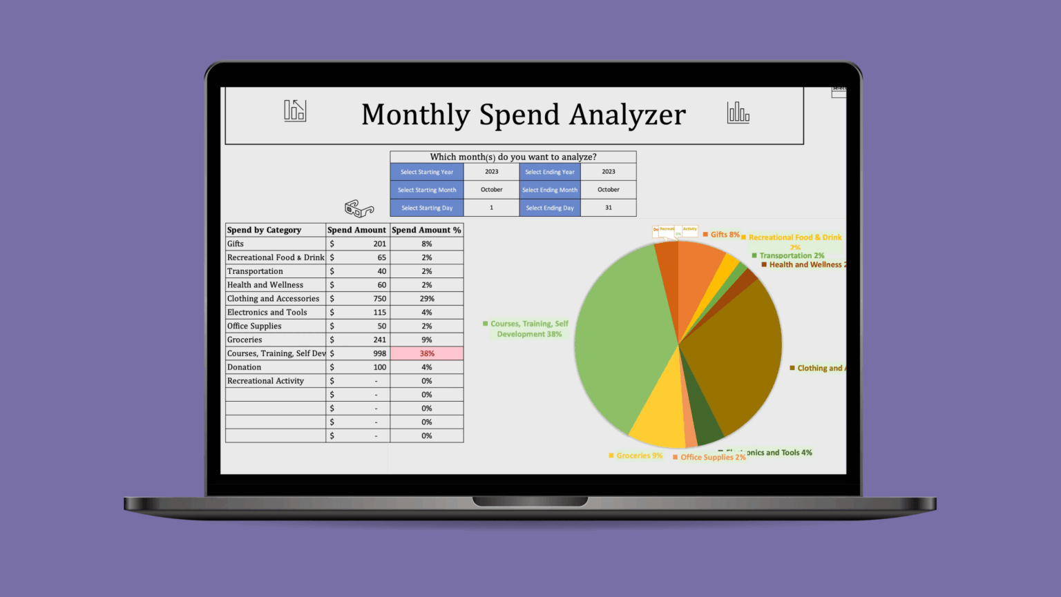 The intelligent formulas will automatically display all your expense categories, the corresponding dollar amount and relative spend %