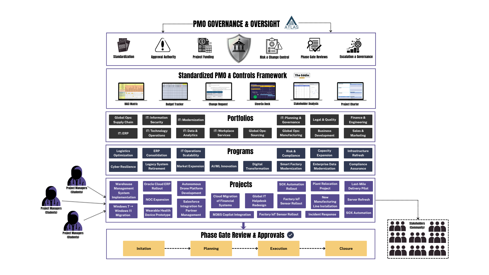 The Eddie System™ is a project management training ecosystem built around a Live PMO (Project Management Office) environment. TES helps aspiring project managers close the experience gap by completing realistic IT project simulations, producing standardized deliverables, and practicing real-world project governance workflows in a structured, Live PMO setting.