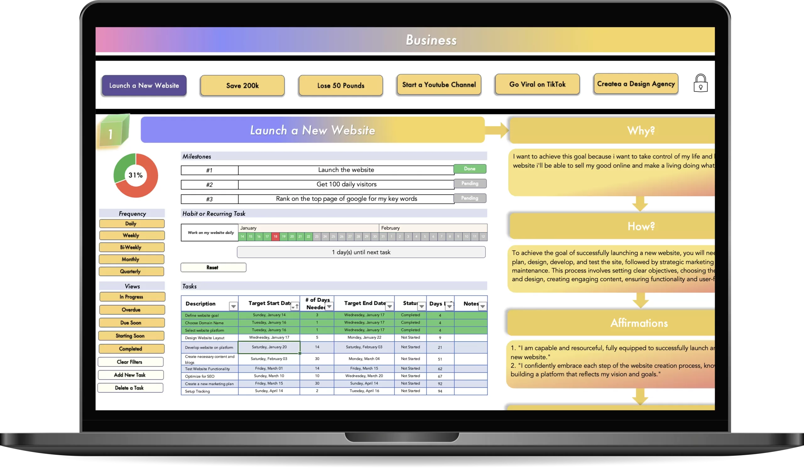 Elevate your goal-setting with the sleek and intuitive Ultimate Goal Tracker. Track six goals, chart milestones, and monitor habits with automated ease. Dive deep with unlimited tasks and one-click progress views. Stay inspired with affirmations and visualizations, making your goals not just plans, but a part of you. Your journey to achievement just got smarter.