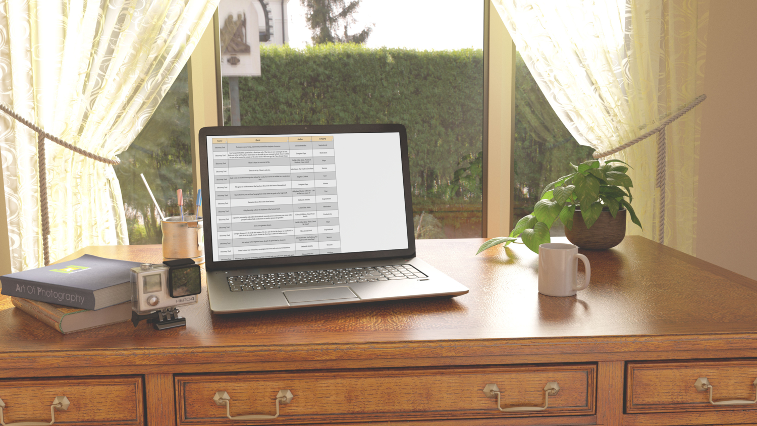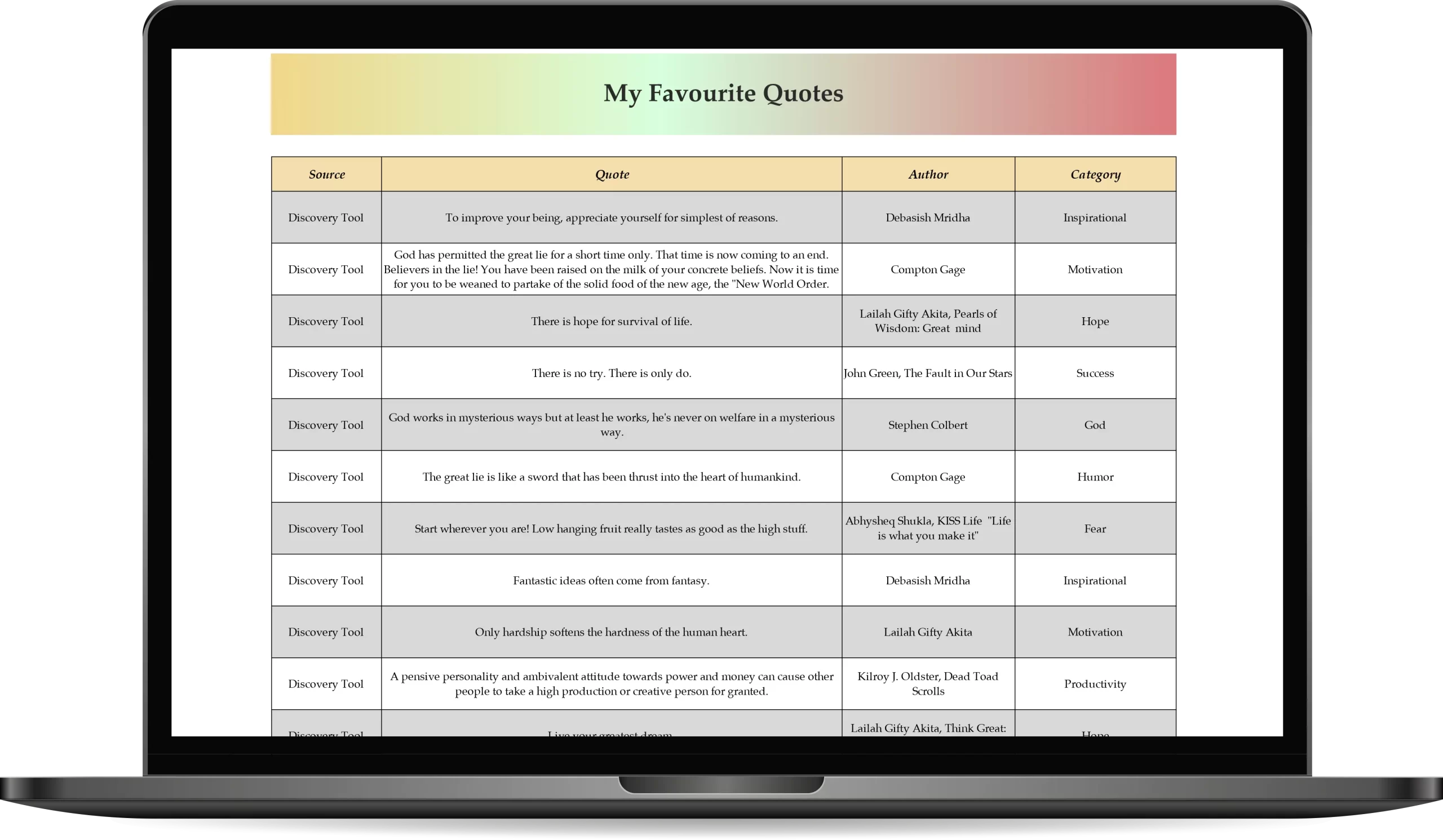 • Provides space to add the source (where the quote was found), the quote itself, the author, and the category of the quote (e.g., motivational, inspirational, etc.).