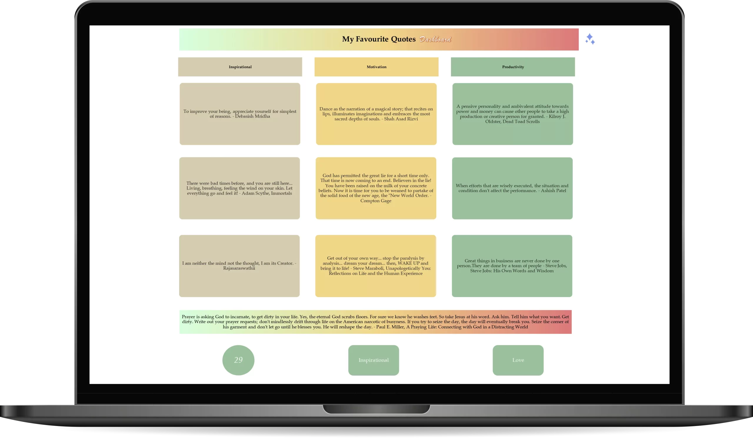• Allows users to select three of their favorite categories of quotes and have those quotes randomly displayed on the dashboard.