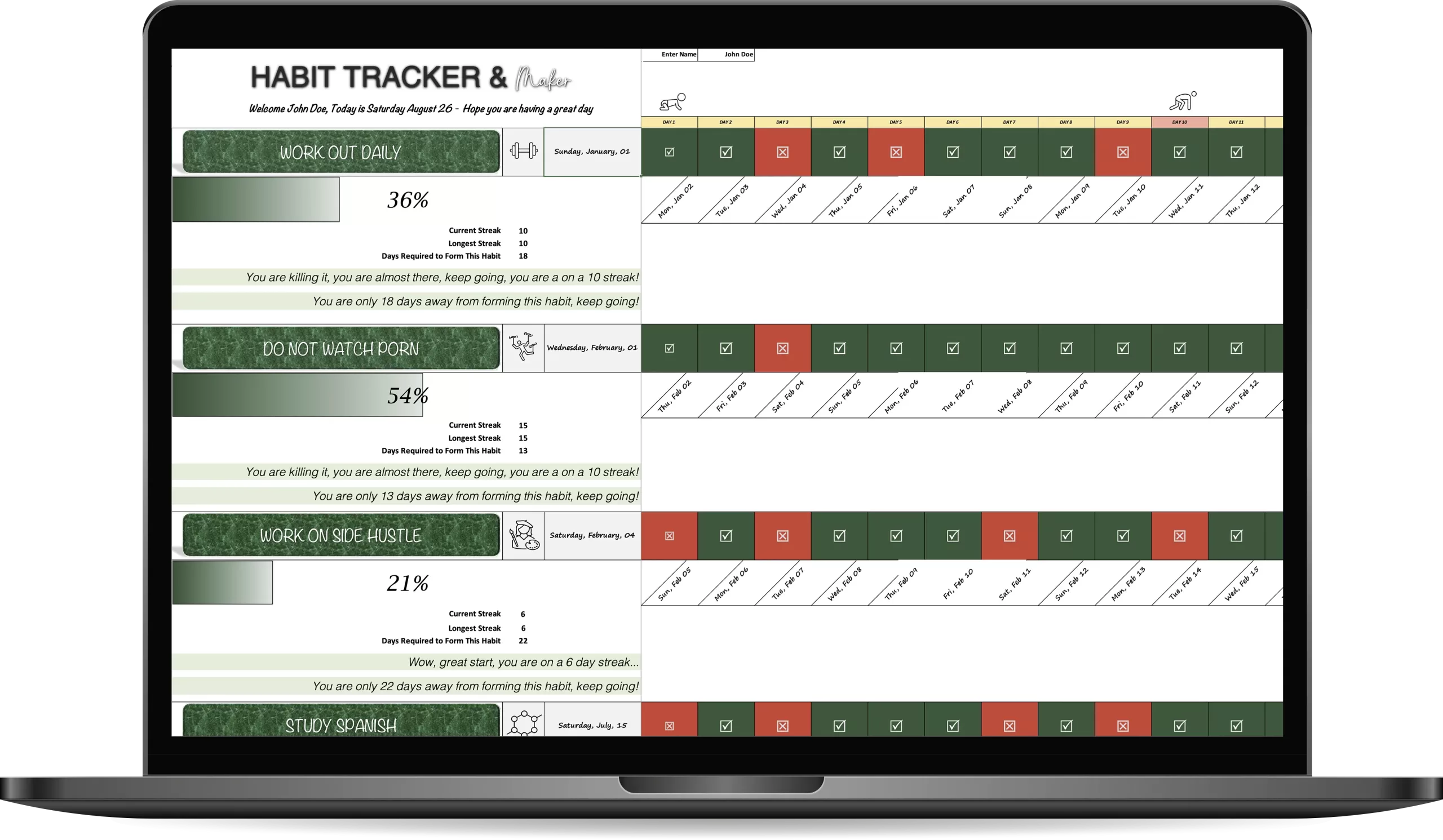 Sleek and Intuitive Design: Our template’s clean and intuitive interface ensures that tracking your habits is a breeze, even if you’re not an Excel expert. Its user-friendly design guarantees a seamless experience for users of all skill levels.