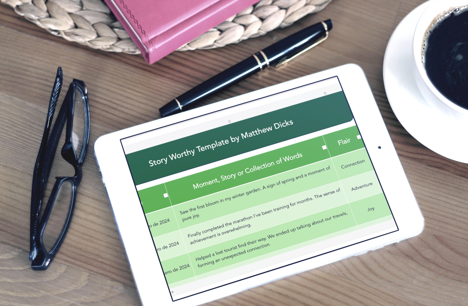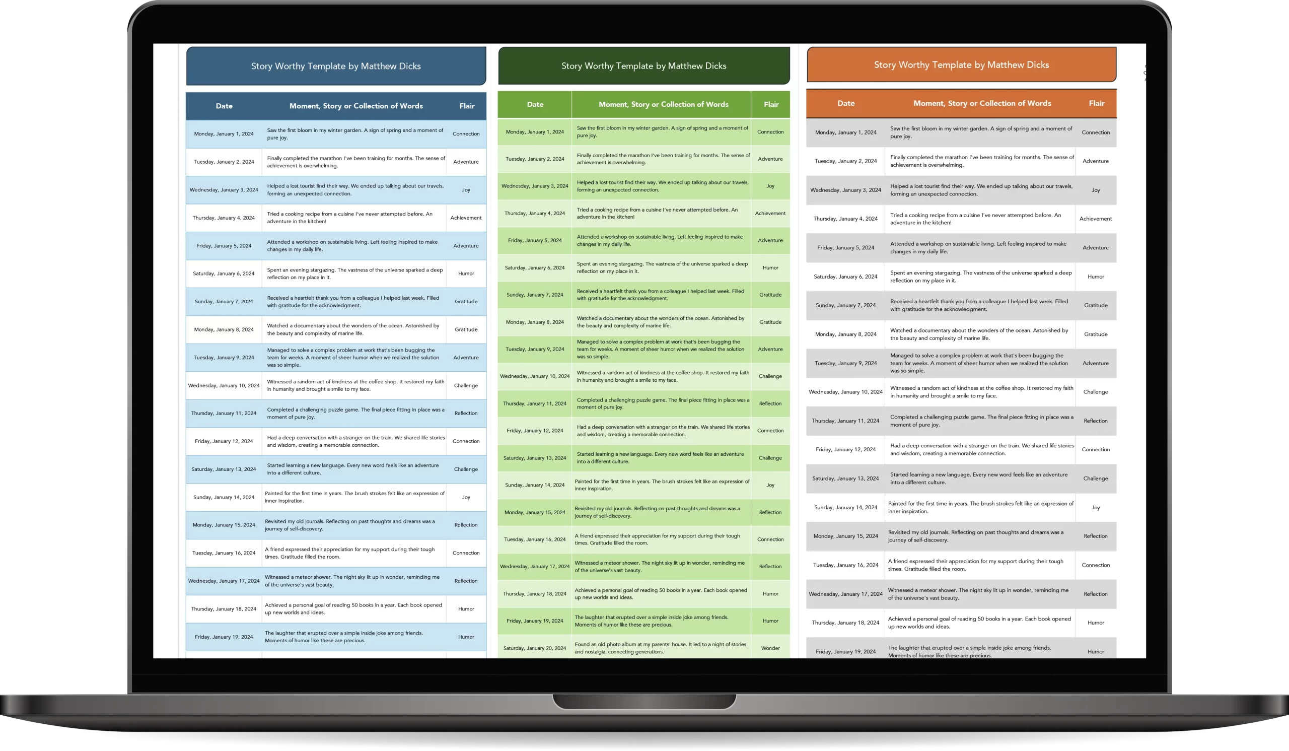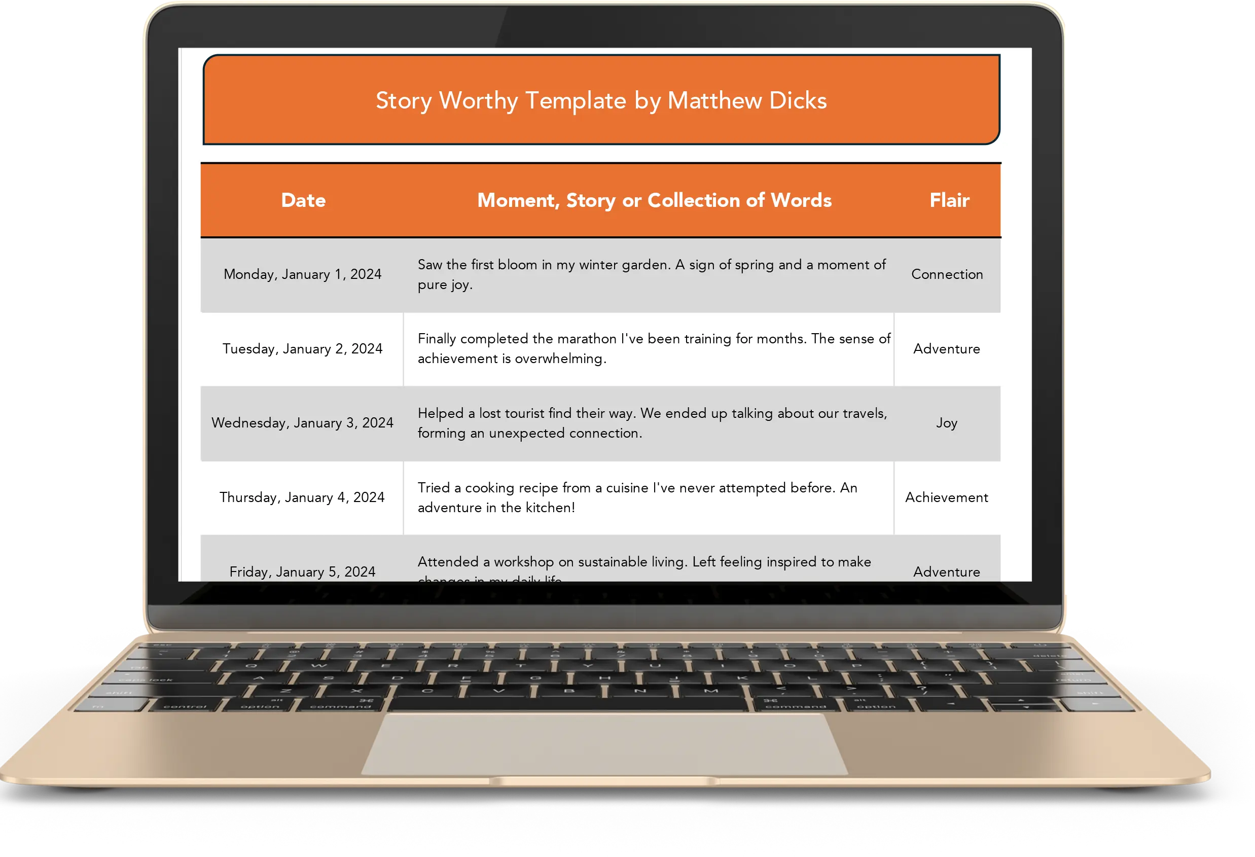 The “Story Worthy Template” by Matthew Dicks is a tool inspired by his book and TED Talk, designed to help you capture the most memorable moments of your life. This Excel template allows you to document and classify your daily stories easily and efficiently.
