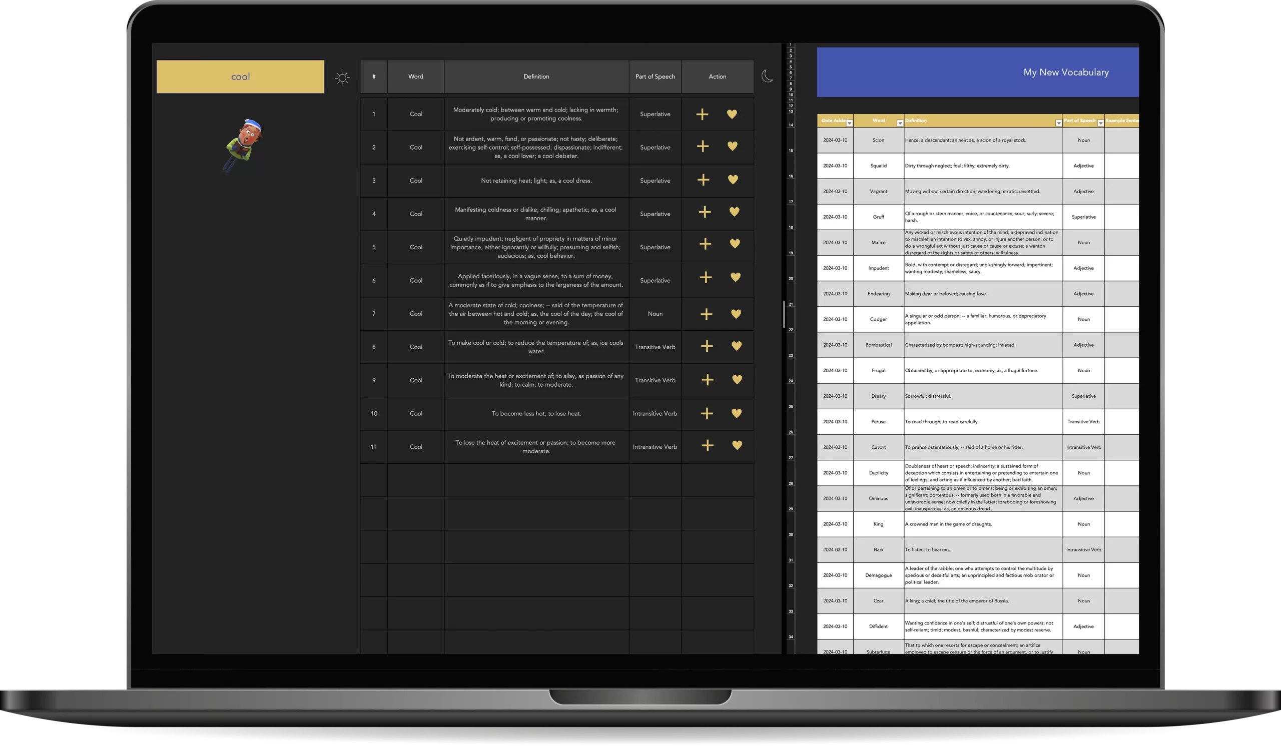 The Vocabulary Tracking System automates the process of searching for definitions and adding new words to a table. With a database of over 175,000 English words, you can quickly find and save new vocabulary. Each entry includes the word’s definition, part of speech, a sample sentence, and the date it was added. You can also mark words as favorites, track your learning progress, and switch between light and dark themes with ease.